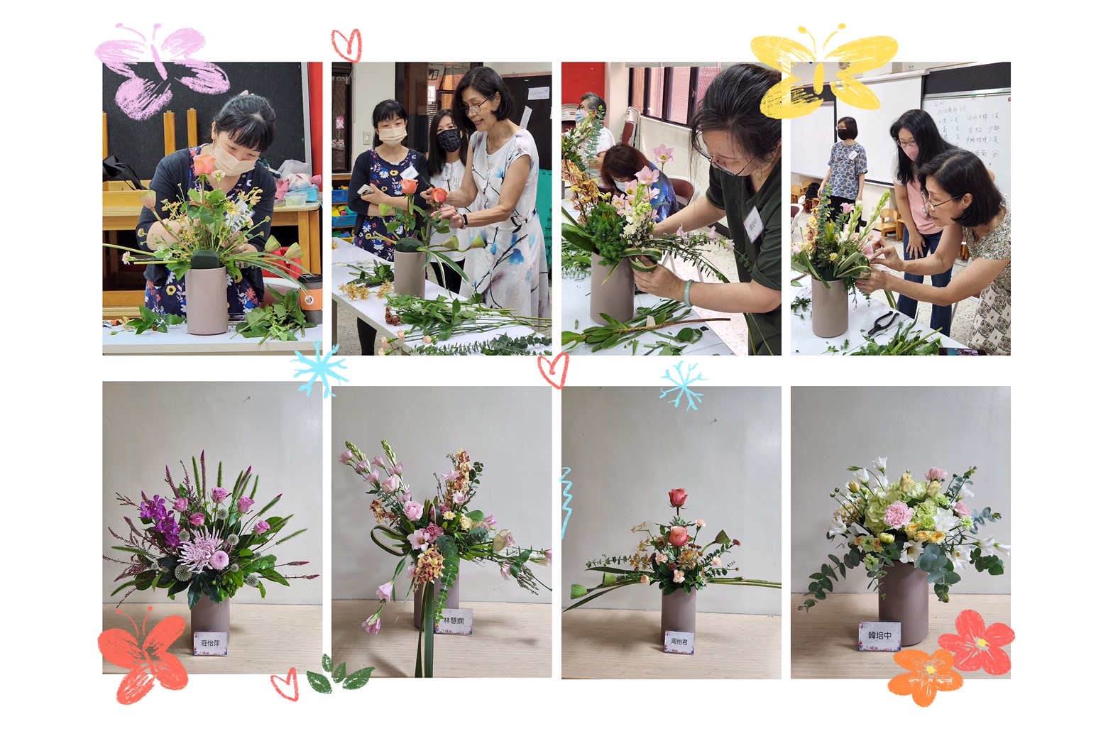 1.基礎花藝理論介紹、基礎花型實作練習,以及花材、花型之介紹